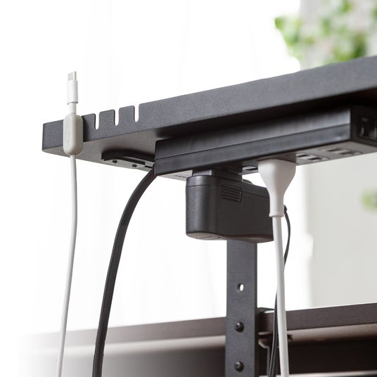 トレーはスライドさせて位置を調整することができます。自分の使いやすい場所にトレーを移動させることができるため、作業効率が向上します。必要に応じてトレーを引き出したり、収納したりすることが可能です。スリット付きでケーブル配線も可能です。