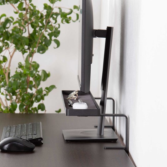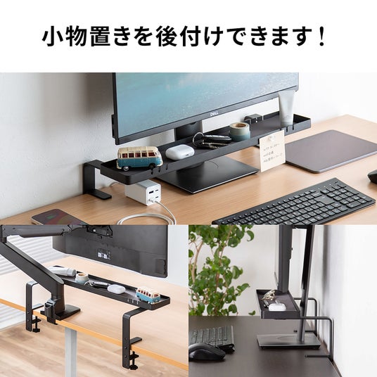 クランプ止めによって、小物トレーをしっかりと固定することができます。これにより、安定性が増し、トレーの位置がずれる心配がありません。取り付けも簡単で、誰でも手軽に設置できます。小物トレーは、モニターアームの下に取り付けての設置も可能です。これにより、モニターの位置を自由に調整しながら、トレーも一緒に使うことができるため、デスク周りのレイアウトがさらに自由になります。