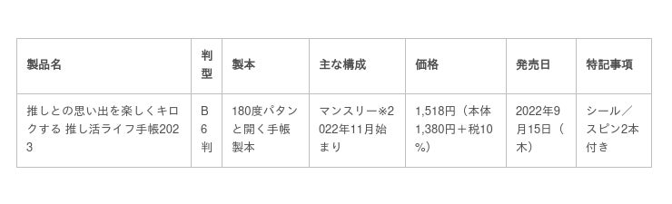 2023年版では推し活を楽しむための機能に特化した『推しとの思い出を楽しくキロクする 推し活ライフ手帳2023』が新たにラインアップに加わりました。
