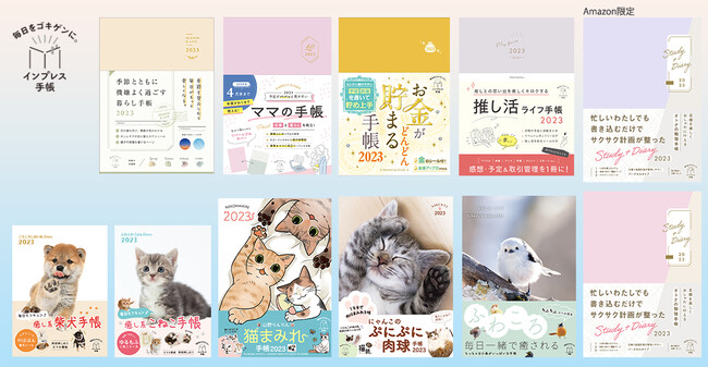 下段:『ころころしばいぬDiary 2023』『ふわふわCats Diary 2023』『山野りんりん 猫まみれ手帳2023』『にゃんこのぷにぷに肉球手帳2023』『ふわころことりSchedule Book2023』『目標を楽しくおしゃれに叶えるオトナの勉強手帳 Study+Diary2023』