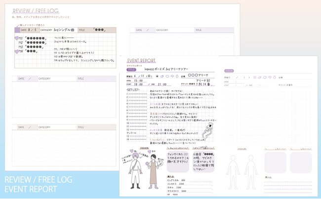 リアルイベント&オンラインイベントのレポートページは26公演分、感想を書けるフリーログは66本分を掲載し、1年分の思い出をしっかり残せます。イベントレポートページには、セットリストや感想を書けるフリー欄、自分の服装や推しの衣装、同行者との合わせコーデについて書ける欄、印象に残ったシーンを書く欄があります。