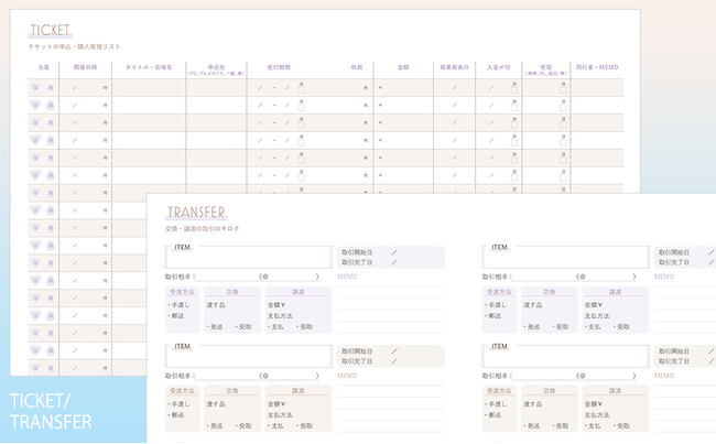「どの公演のチケットを申し込んだ?」「誰と何のグッズを交換する約束だっけ?」など、混乱しがちなチケットの申込や、グッズの譲渡のやり取りをまとめるリストも用意しています。一覧で見やすくスッキリ管理できる便利なページです。