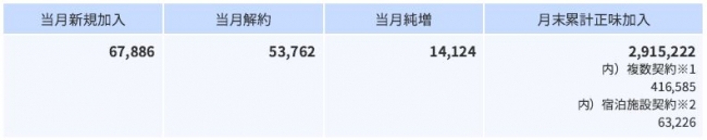 ※2:宿泊施設の客室で視聴するための宿泊施設事業者との契約については、視聴料金を個別に定めており、当該宿泊施設における契約客室の累計正味加入件(室)数は、月末累計正味加入件数に含めております。