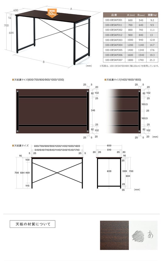 今回、3種類のワークデスク(100-DESKF011BK(幅70cm・ブラック)、100-DESKF011BK(幅70cm・ライトブラウン)、100-DESKF012BK(幅90cm・ブラック))が新登場。シリーズで豊富なサイズ展開となり、横幅60cm、70cm、80cm、90cm、100cm、120cm、140cm,160cm、180cmから自分のスペースにぴったりのデスクを選ぶことができます。