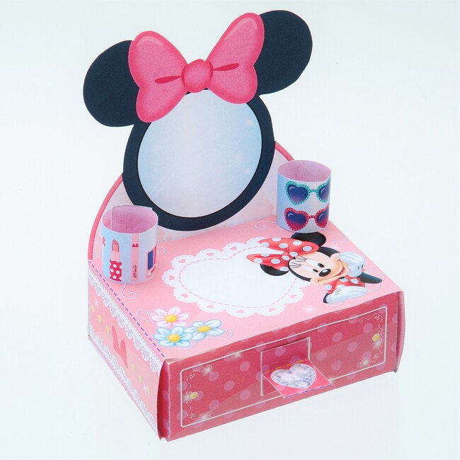 はさみとのりで作れるかわいい紙工作♪ ミニーの形の鏡がキュートな、引き出しつきのドレッサーです。ブレスレットやイヤリングなど、小物をしまって使えます♥