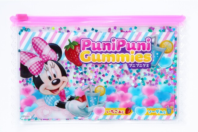 中に付録や小物を入れて使えるミニーのクリアポーチ。いちごとソーダのグミのパッケージをイメージしたデザインで、ふるとハート型のラメが動きます♥