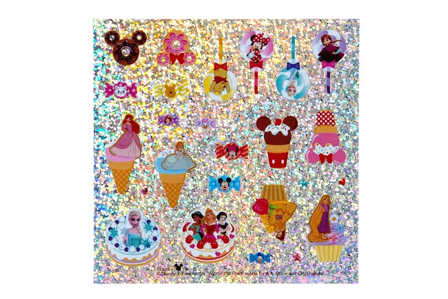 ミッキーやプーさん、プリンセスたちがお菓子といっしょにキラキラシールに大変身★ 好きなところに貼ったり、お手紙や持ち物をデコったりして遊べます♪