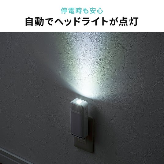 コンセントから取り外した際にも、先端LEDが自動で点灯し、懐中電灯として使用できます。突然の停電やアウトドアでの使用にも適しています。
