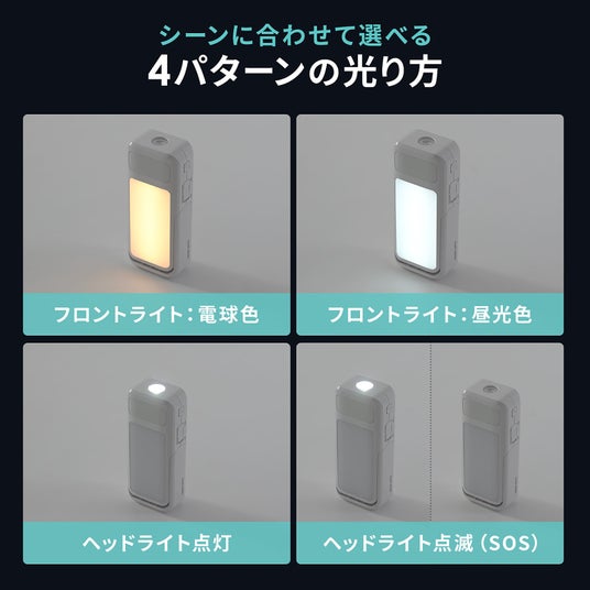 この製品は、人感明暗センサーを搭載しており、周囲が暗くなり人を感知すると自動で前面LEDが点灯します。この機能により、夜間の移動や突然の暗闇でも安心してお使いいただけます。