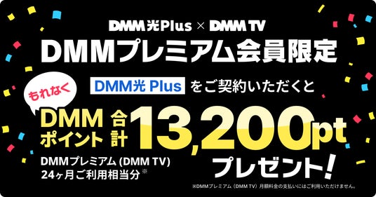 ~ DMMプレミアム会員限定、「DMM光 Plus」を契約した方全員にDMMポイント13,200pt(550pt×24ヶ月)をプレゼント! ~