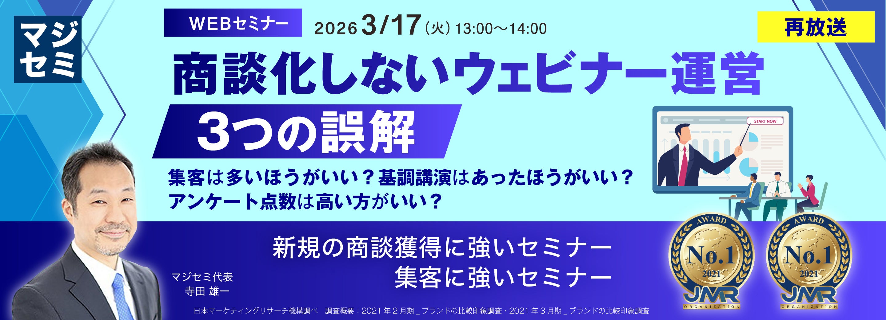 マジセミ株式会社は「【再放送】商談化しないウェビナー運営、3つの誤解」というテーマのウェビナーを開催します。