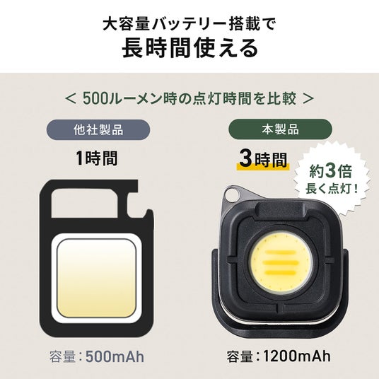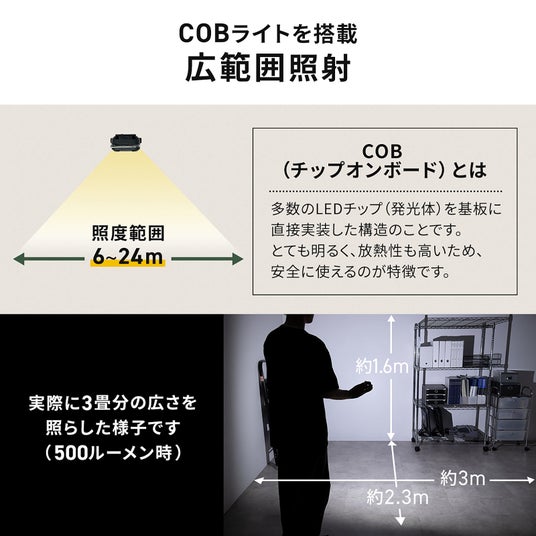 面発光COB LEDライトを搭載し、最大500ルーメンで一度に広範囲を照らします。夜間の作業や緊急時に頼りになる明るさを提供します。