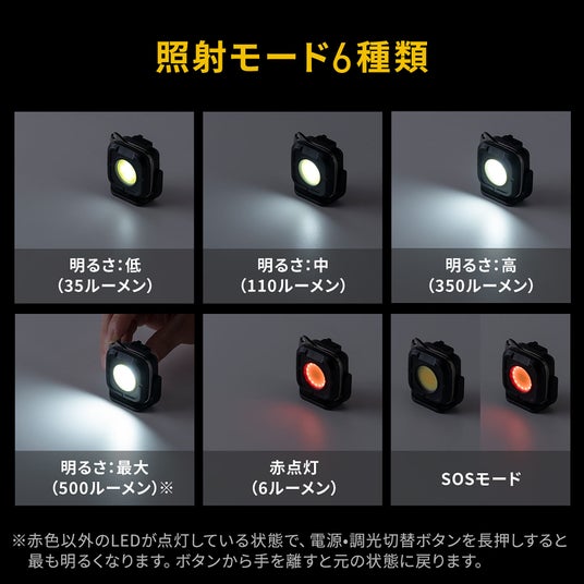 ON/OFFスイッチで4段階の明るさ調整が可能で、赤色点灯/点滅モードも搭載。吊り下げ用カラビナフックやマグネット、バッテリーインジケータ、収納袋も付属しており、様々なシーンで使い勝手抜群です。