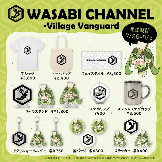 おなじみのWASABI CHANNELのロゴはもちろんの事、まさかの安曇野黒岩わさび園のマスコットキャラクター、「湧水わさび」ちゃんのキャラクターグッズも登場! 一粒で2度美味しい素敵なコラボをしていただけました!