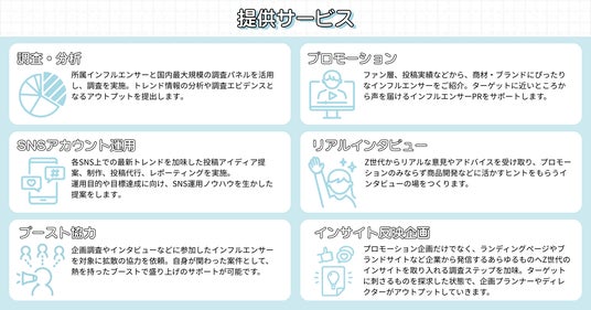 本サービスは、Z世代を対象とした各種リサーチやSNSアカウント運用支援、インフルエンサーを活用したPR施策、さらにはZ世代との共創プロジェクトなどを通じて、企業がZ世代とより深く本質的な関係を築けるよう支援いたします。トレンドの中心となるZ世代の価値観を的確に捉えた共感性の高いコミュニケーション設計を行うことで、企業のマーケティング活動を一層効果的に推進してまいります。