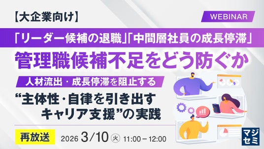 マジセミ株式会社は「【再放送】【大企業向け】「リーダー候補の退職」「中間層社員の成長停滞」管理職候補不足をどう防ぐか」というテーマのウェビナーを開催します。