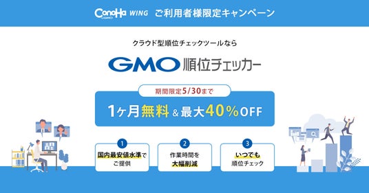 なお、「GMO順位チェッカー」では、現在、国内最速レンタルサーバー(※2)「ConoHa WING byGMO」(https://www.conoha.jp/wing/)のご契約者を対象に、初月無料&最大40%OFFで「GMO順位チェッカー」がご利用いただけるキャンペーンを2025年5月30日まで開催しています。(※3)