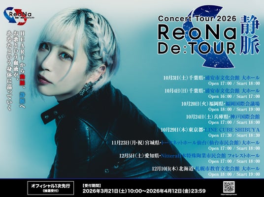 「ReoNa 動脈・静脈プロジェクト」として7月よりオールスタンディングライブハウスツアー「ReoNa Live Tour 2026 “De:TOUR-動脈-”」の開催が決定しており、2026年10月からはオールシーティングのReoNa Concert Tour 2026 “De:TOUR -静脈-”の開催決定を発表。