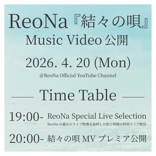 さらに、Music Videoプレミア公開に先駆け、同日の4月20日(月)19:00からは、ReoNaの過去のライブ映像を抜粋した約1時間の特別ライブ配信がオフィシャルYouTubeチャンネルで実施されることも決定した。