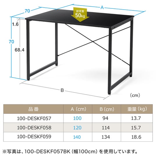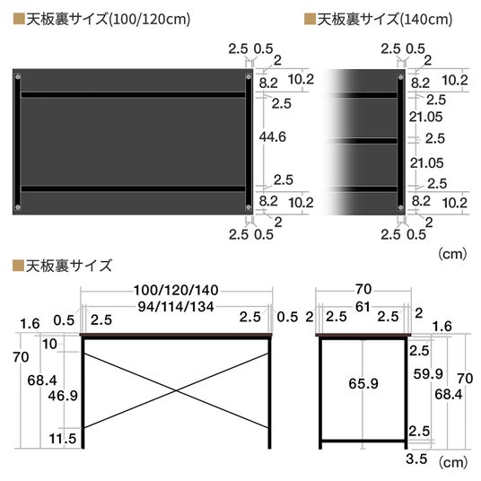 横幅は100cm、120cm、140cmの3サイズ展開で置き場所や利用シーンに合わせて、ぴったりのデスクをお選びいただけます。
