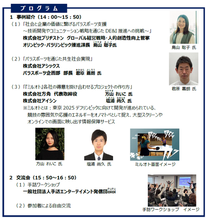 東京2020パラリンピックをきっかけにパラスポーツに関わる企業や東京2025デフリンピックに向けて取組を展開している企業の好事例をご紹介します。また、他社とのネットワーク構築や情報交換ができる交流会も実施します。