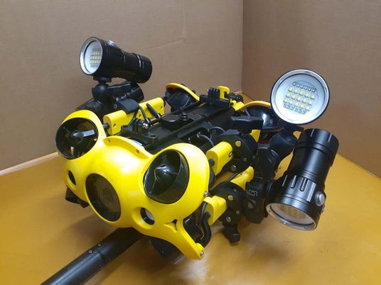 「水中ドローン海難事故捜索仕様」 高輝度水中ライトを複数搭載して暗い海中での広範囲な捜索を可能としている。 搭載されている遠隔操作アームにより海中にある捜索物を掴むことが可能であり機体の位置保持を行うことにより救助活動の効率化を図ることができる。水中ドローンの映像をリアルタイムで鮮明化する映像処理装置「画像鮮明化装置IVCS」と組み合わせて使用することで水中での探索に活用されます。