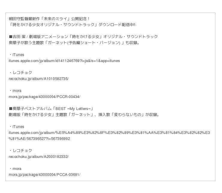 細田守監督最新作『未来のミライ』公開を記念して、角川シネマ新宿で開催中の「細田守フィルムフェスティバル」。アニメ『時をかける少女』の主題歌を担当した奥華子さんのミニライブ付きスペシャル上映会が8月4日(土)に行われました。