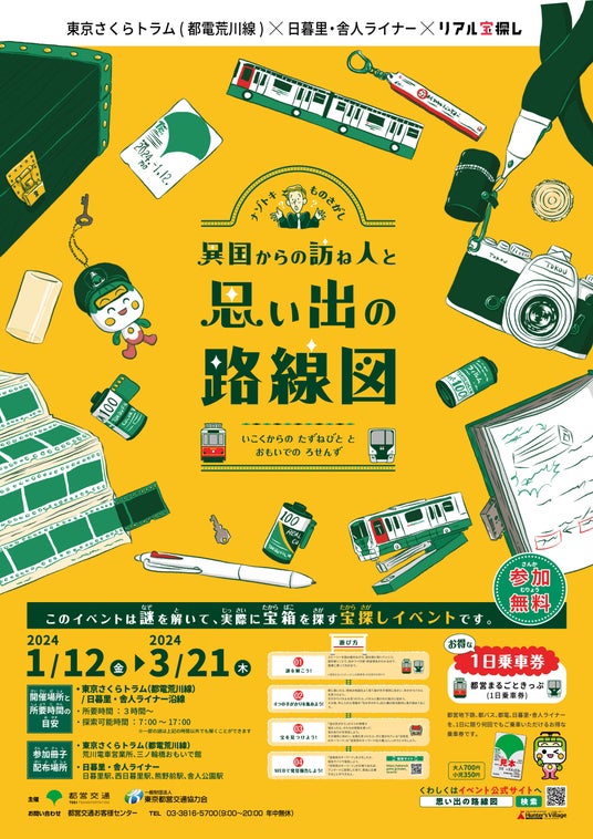 東京都交通局では、東京さくらトラム(都電荒川線)×日暮里・舎人ライナー×リアル宝探し「異国からの訪ね人と思い出の路線図」を、令和6年1月12日(金)から令和6年3月21日(木)まで実施します。