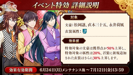 期間中「松岡譲」「直木三十五」「永井荷風」の衣装を編成して潜書すると、得点の獲得数がそれぞれ50%上昇します。また、「水」属性の衣装を編成して潜書すると、得点の獲得数がそれぞれ20%上昇します。