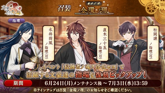 召装『金環ノ理』のラインナップを更新いたしました。この召装では、イベント『浄化任務「侵蝕者ノ魂ヲ浄化セヨ」』で活躍する「松岡譲」「直木三十五」「永井荷風」の指環を一定の確率で入手できます。