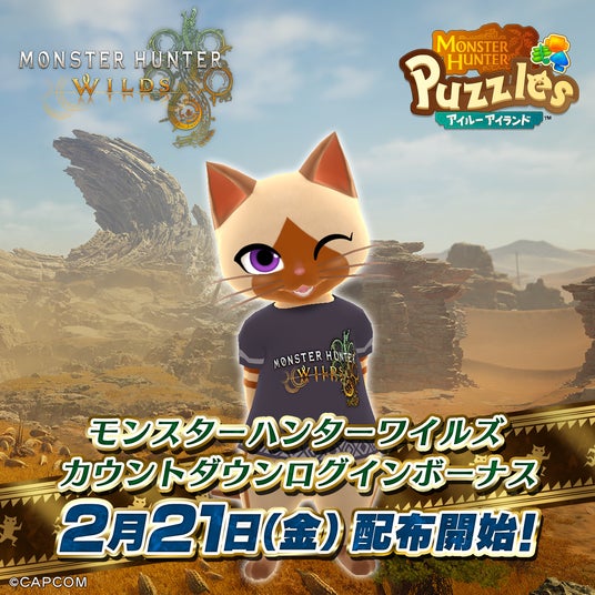 iOS/Android『モンスターハンターパズル アイルーアイランド』では、2025年2月28日(金)の『モンスターハンターワイルズ』の発売を記念して、本日2025年2月21日(金)より「モンスターハンターワイルズ カウントダウンログインボーナス」を配布いたします。