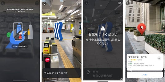 5.周辺の建物などにカメラを向けて周辺情報を読取 → 6.矢印が画面に表示され、目的地まで案内します。 → 7.歩きスマホ防止機能として注意喚起が表示されます。 → 8.注意喚起が表示されます。