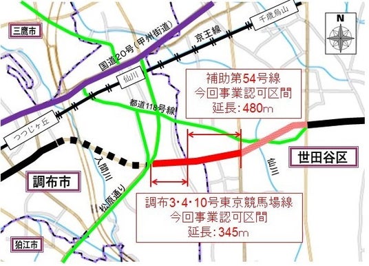 補助第54号線は、渋谷区富ヶ谷二丁目から世田谷区上祖師谷五丁目に至る延長約9.0kmの都市計画道路です。また、調布3・4・10号東京競馬場線は、調布市若葉町二丁目から同市飛田給二丁目に至る延長約7.4kmの都市計画道路です。