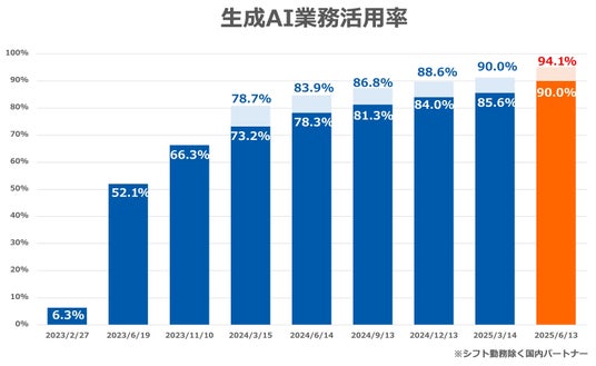 ・ 国内パートナー(シフト勤務除く)の94.1%が生成AIを活用(前回調査差+4.1ポイント)。