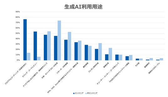 ・ 生成AIを業務活用しているエンジニアのうち86.8%が生成AIコーディングを利用用途として使用しており、非エンジニアについても44.0%のパートナーが生成AIコーディングをしていることがわかりました。