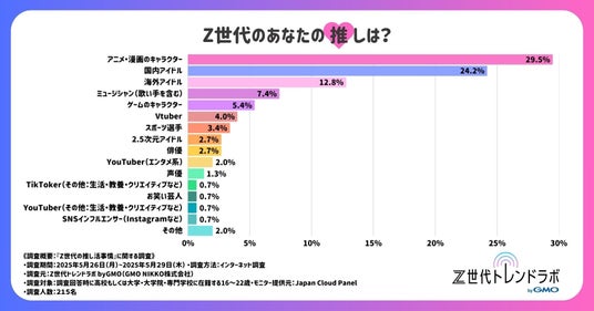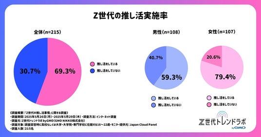 GMOインターネット株式会社の連結会社で、総合マーケティング支援事業を展開するGMO NIKKO株式会社(代表取締役社長執行役員:佐久間勇 以下、GMO NIKKO)が提供する、Z世代とのコミュニケーションに課題を持つ企業に向けたマーケティング支援サービス「Z世代トレンドラボ byGMO」では、高校生~大学生・大学院生・専門学生215人を対象に、「Z世代の推し活事情に関する自主調査」を実施しました。