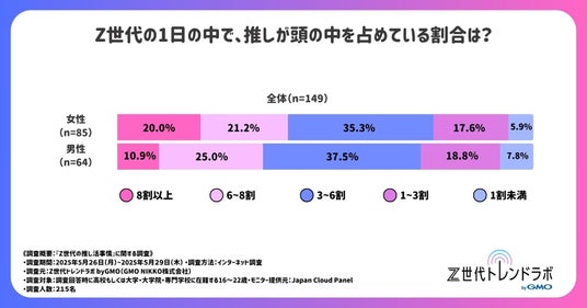 - 日常生活の中で“推し”が占める思考割合:女性の18.7%が「常に“推し”のことを考えている」と回答。