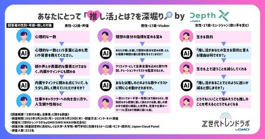 さらに当社の連結企業群でCM動画に関するリサーチ事業を展開するGMOプレイアド株式会社(代表取締役社長:冨岡 信之 以下、GMOプレイアド)が提供する、生成AIを活用した新しいオンラインリサーチサービス「Depth X byGMO」の機能を活用して、個々の回答に応じた設問を実施し、さらなる深掘り調査を実施しました。深掘りによって得られた回答からは「(「推し活」は)内面やマインドにも関わる」「理想の自分の指標を定める営み」など、“推し”の存在が自己成長のためのモチベーションとも深く結びついていることが見えてきました。