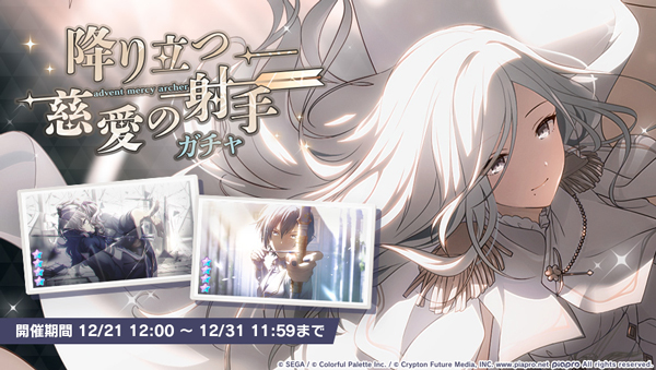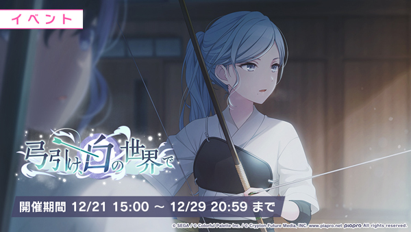 株式会社セガ(本社:東京都品川区、代表取締役社長COO:杉野行雄)と株式会社Colorful Palette(本社:東京都渋谷区、代表取締役社長:近藤裕一郎)は、iOS/Android向けリズム&アドベンチャー『プロジェクトセカイ カラフルステージ! feat. 初音ミク(以下、プロジェクトセカイ)』について、2022年12月21日(水)よりゲーム内イベント「弓引け、白の世界で」、「降り立つ慈愛の射手ガチャ」を開催中です。