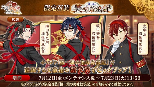 さらに、イベントと同時に開催される限定召装『檀一雄の美味放浪記』にて新規追加された「坂口安吾」「織田作之助」「太宰治」の〈応援団風衣装〉を編成すると、得点の獲得率がそれぞれ30%上昇します。