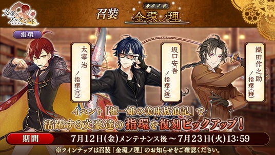 召装『金環ノ理』のラインナップを更新いたしました。この召装では、イベント『特殊調査任務「檀一雄の美味放浪記」』で活躍する「坂口安吾」「織田作之助」「太宰治」の指環を一定の確率で入手できます。