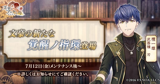 合同会社EXNOA(本社:東京都港区、CEO:村中 悠介、URL:https://games.dmm.com/ )が運営するDMM GAMESは、7月12日(金)より、女性向け文豪転生シミュレーションゲーム「文豪とアルケミスト」において、檀一雄の新たな「覚醒ノ指環」を追加いたしました。