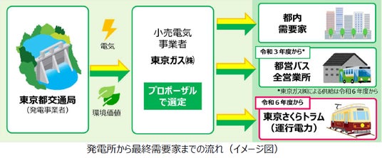 令和6年4月から、都内の需要家※のみなさまには、東京ガス株式会社を通じて、交通局の水力発電由来の電気をご利用いただくとともに、交通局でも、都の率先行動の一環として、都営バス全営業所での電気の使用に加え、東京さくらトラム(都電荒川線)を100%東京産水力発電の電気で運行いたします。