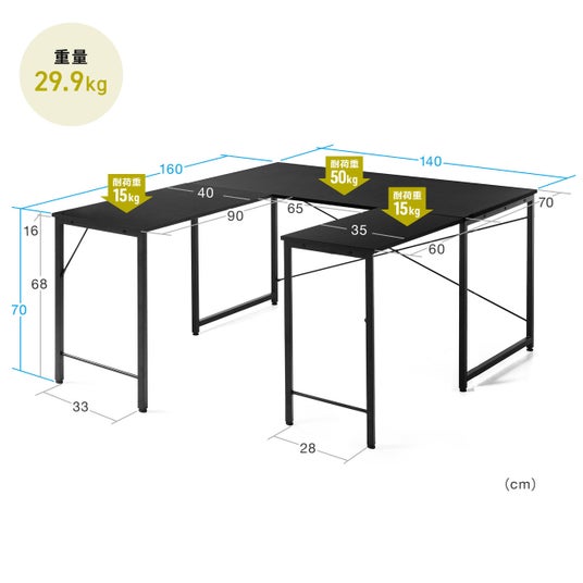 コの字デスク シンプルデスク 幅140cm 奥行160cm ブラック モニターアーム対応
