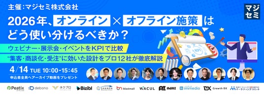 マジセミ株式会社は「2026年、オンライン×オフライン施策はどう使い分けるべきか?」というテーマのウェビナーを開催します。