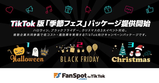 GMOインターネットグループで、GMOインターネット株式会社(代表取締役 社長執行役員:伊藤 正 以下、GMOインターネット)の連結会社である、SNSや動画プラットフォームを活用したマーケティング支援事業を展開するGMOユナイトエックス株式会社(代表取締役社長:稲葉 裕一郎 以下、GMOユナイトエックス)は、2025年9月1日(月)より、TikTokを活用したキャンペーンパッケージ「FanSpot byGMO for TikTok 季節フェス」の提供を開始します。本サービスは、ユーザーの特定の「瞬間(モーメント)」に焦点を当てたタイムリーなモーメント型キャンペーン(※1)商品として、ハロウィン、ブラックフライデー、クリスマスの3大イベントに対応した期間限定パッケージです。