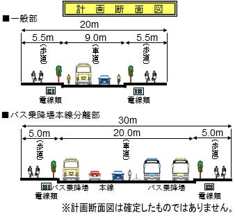 このうち、本事業は、上記の施行箇所において、幅員約15mの道路を20~30mに拡幅整備するものです。車道は2車線、その両側に歩道を整備するとともに、無電柱化や街路樹の植栽を行います。また、バス・タクシー乗降場を本線交通と分離して整備します。