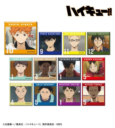 日向翔陽、影山飛雄、月島蛍、山口忠、及川徹、岩泉一、黒尾鉄朗、孤爪研磨、木兎光太郎、赤葦京治、牛島若利、天童覚の印象的な場面写をスクエア缶バッジに仕上げました。