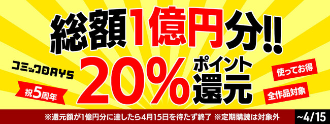※本イベントは総額1億円分のポイントをユーザー全体の還元上限として実施するものとなります。アプリ版コミックDAYS/WEB版コミックDAYS両方の還元総額が1億円に到達した場合、キャンペーン期間内であっても終了となります。