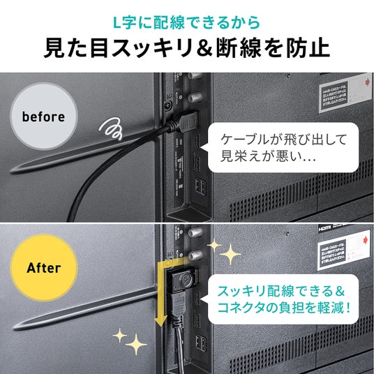 壁掛けテレビの背面や、棚の狭いスペースなど機器裏側のスペースが狭くケーブルのコネクタが邪魔になる時にケーブルをスッキリ配線することができます。